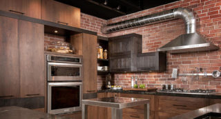 Древесные короба после предварительной обработки поверхностей гармонично сочетаются с лицевыми панелями кухонного гарнитура, сделанного под дерево.