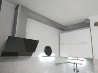 В инструкции по установке телескопических вытяжек подробно указываются требуемые размеры шкафов или коробов и свободного пространства в них. При их подсоединении к замаскированным вентиляционным каналам главное – не нарушить дизайна кухонного помещения. Самый простой и удобный подход к решению проблемы – использование для маскировки коммуникаций коробов из гипсокартонных заготовок.